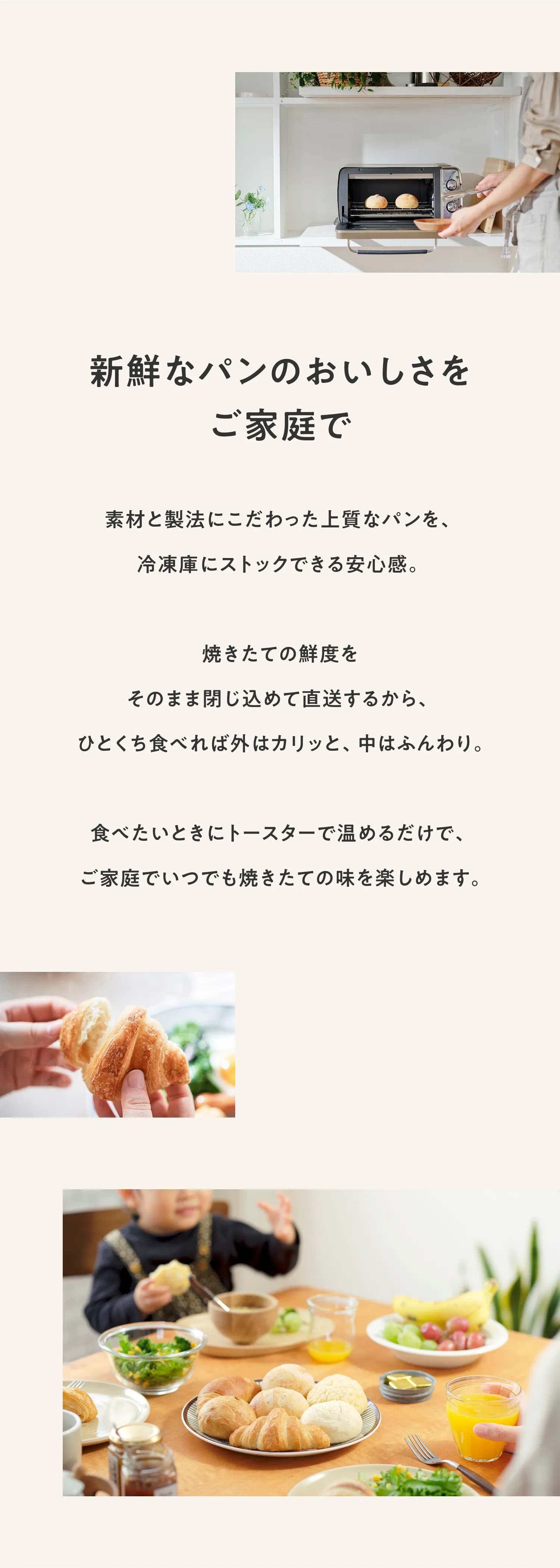 素材と製法にこだわった上質なパンを、冷凍庫にストックできる安心感。焼きたての鮮度をそのまま閉じ込めて直送するから、ひとくち食べれば外はカリッと、中はふんわり。食べたいときにトースターで温めるだけで、ご家庭でいつでも焼きたての味を楽しめます。
