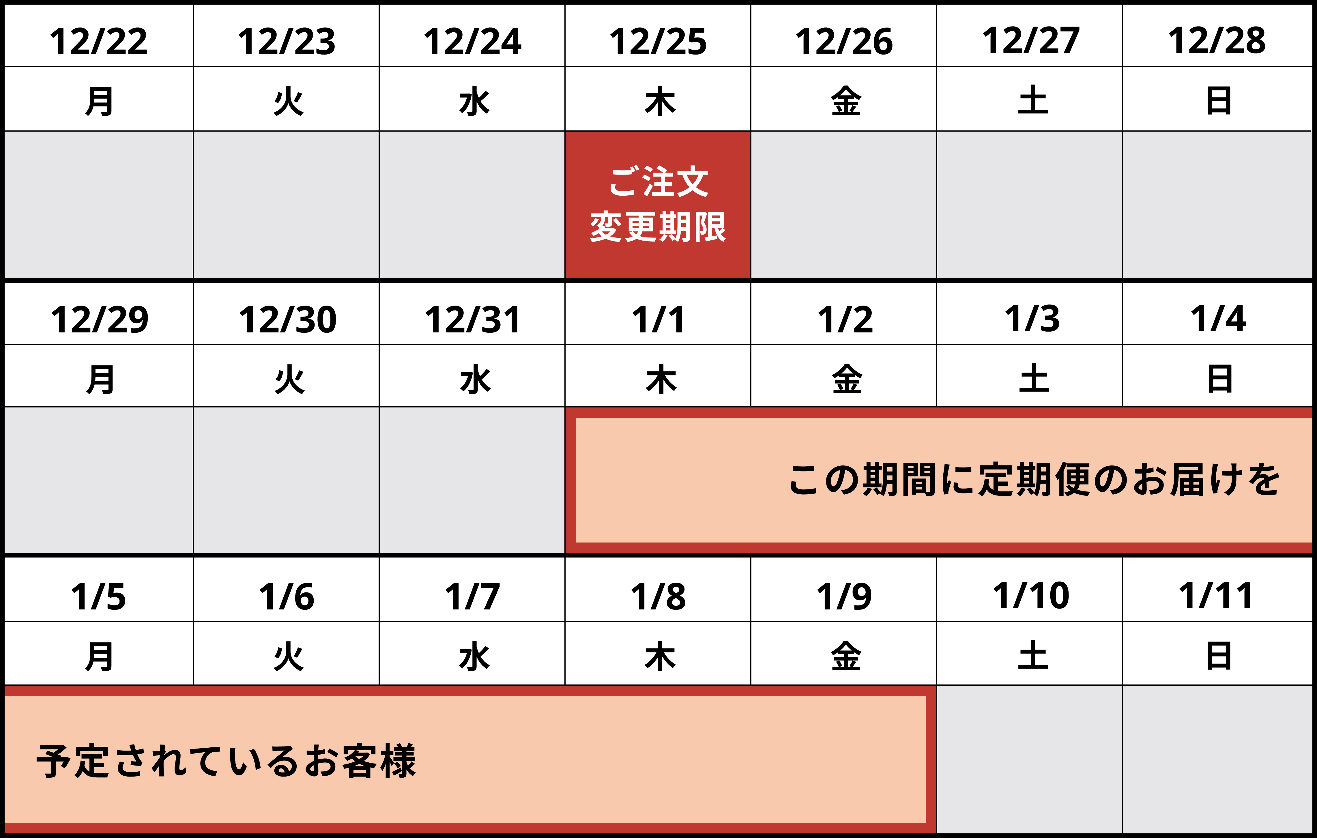 定期便をご利用いただいておりますお客様のうち2026年1月1日(木)~1月9日(金)のお届けが予定されているお客様につきましては、【12月25日(木)まで】に次回配送のご注文内容をご確認ください。
